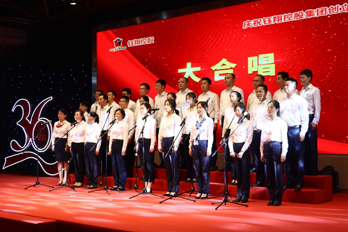 活動尾聲,鈺翔合唱隊現場演唱了《祝你生日快樂》、《我和我的祖國》兩首歌曲,最后集團領導登臺與合唱隊一起合唱《相親相愛的一家人》,帶領全場員工起立互動,將整個慶典活動推到高潮。